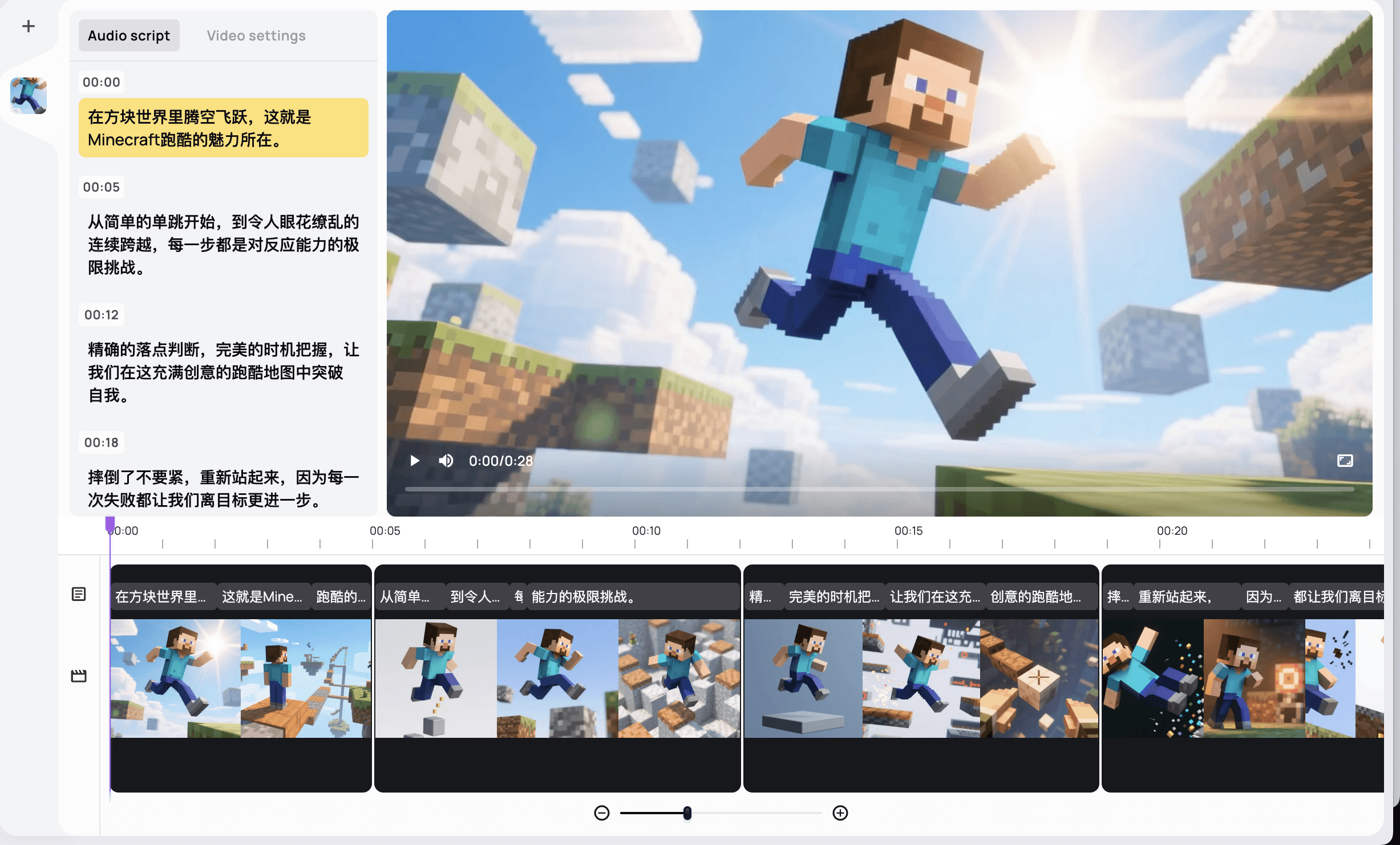 Medeo’s Minecraft Parkour Video Generator is an AI-powered tool that transforms your scripts and maps into dynamic Minecraft parkour videos. Perfect for content creators, it automatically adds voice-overs, effects, and synchronized gameplay—no recording or editing skills required.