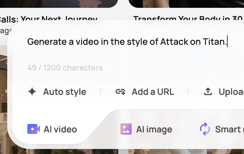 Create epic Attack on Titan–style AI videos from text or images. Generate short anime scenes, titan transformations, and AOT fan edits in minutes—perfect for TikTok and anime creatives.