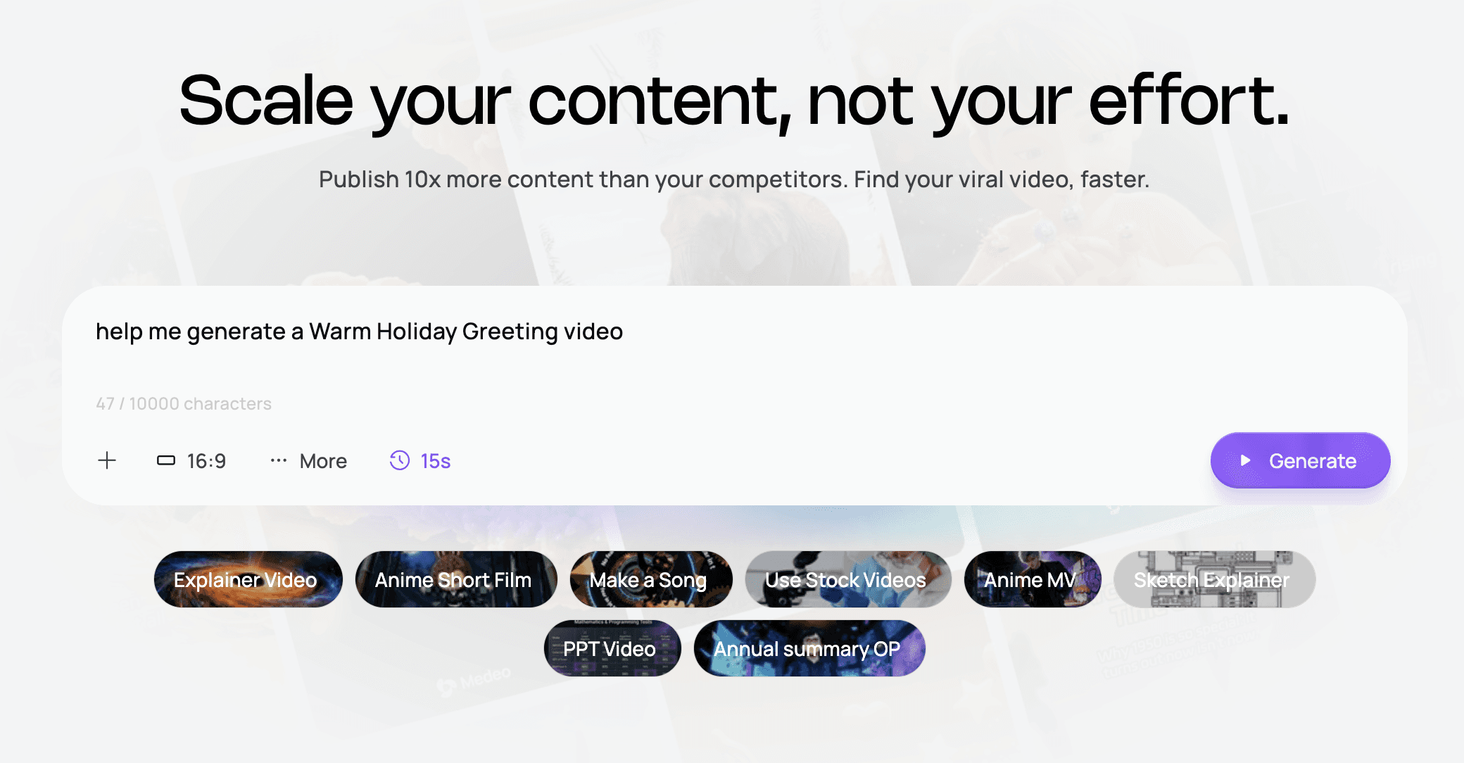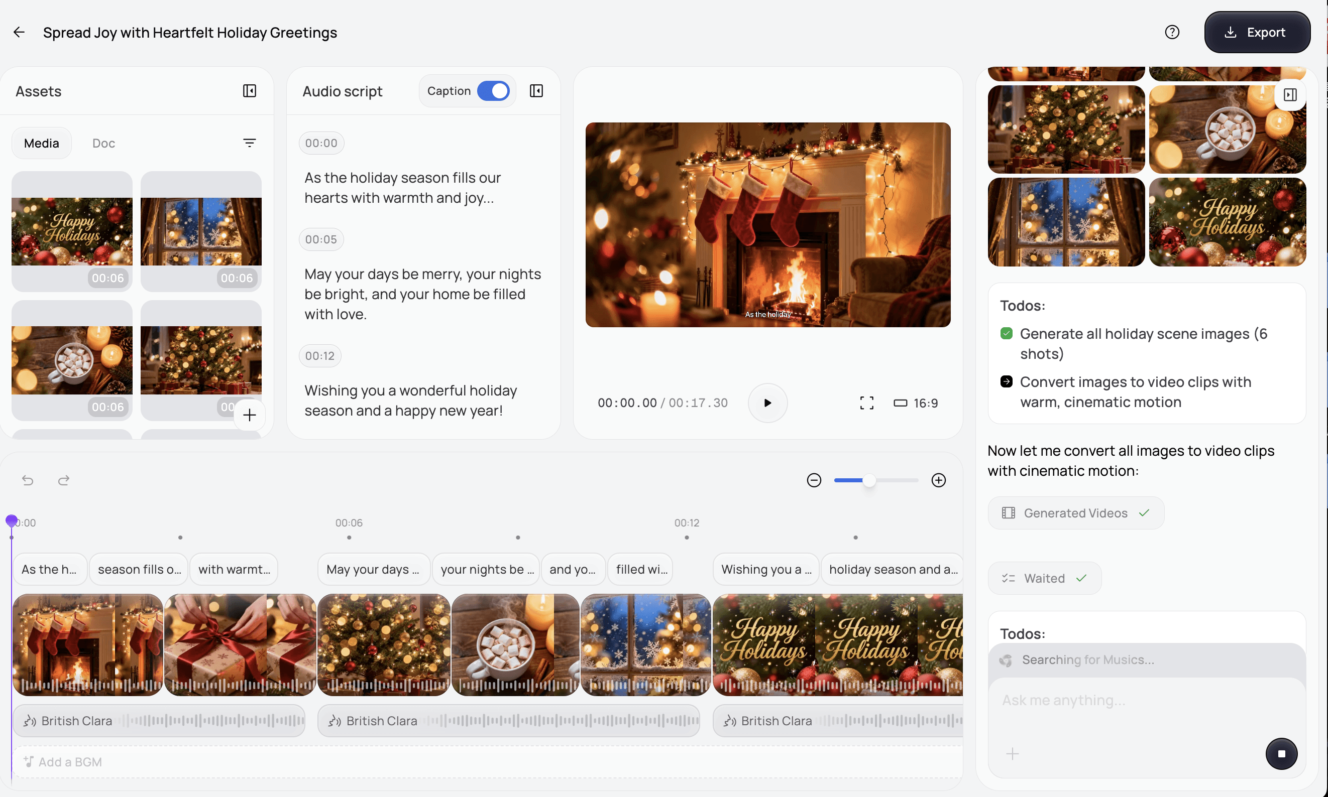 Generate a complete holiday greeting video in seconds—no editing skills needed.