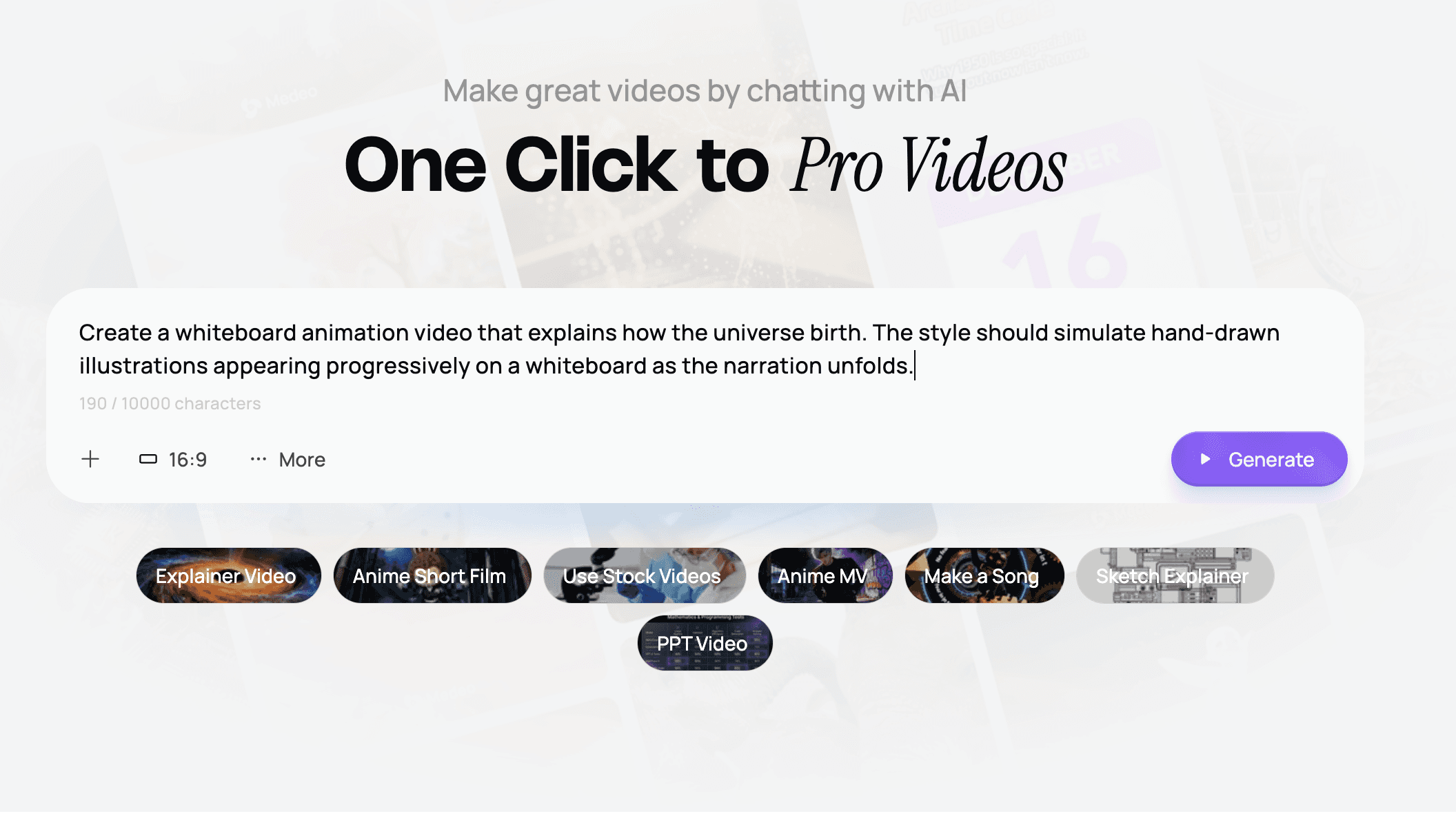 Create stunning AI whiteboard animation videos quickly and easily. Our online generator helps you produce engaging explainers, marketing content, and educational videos.