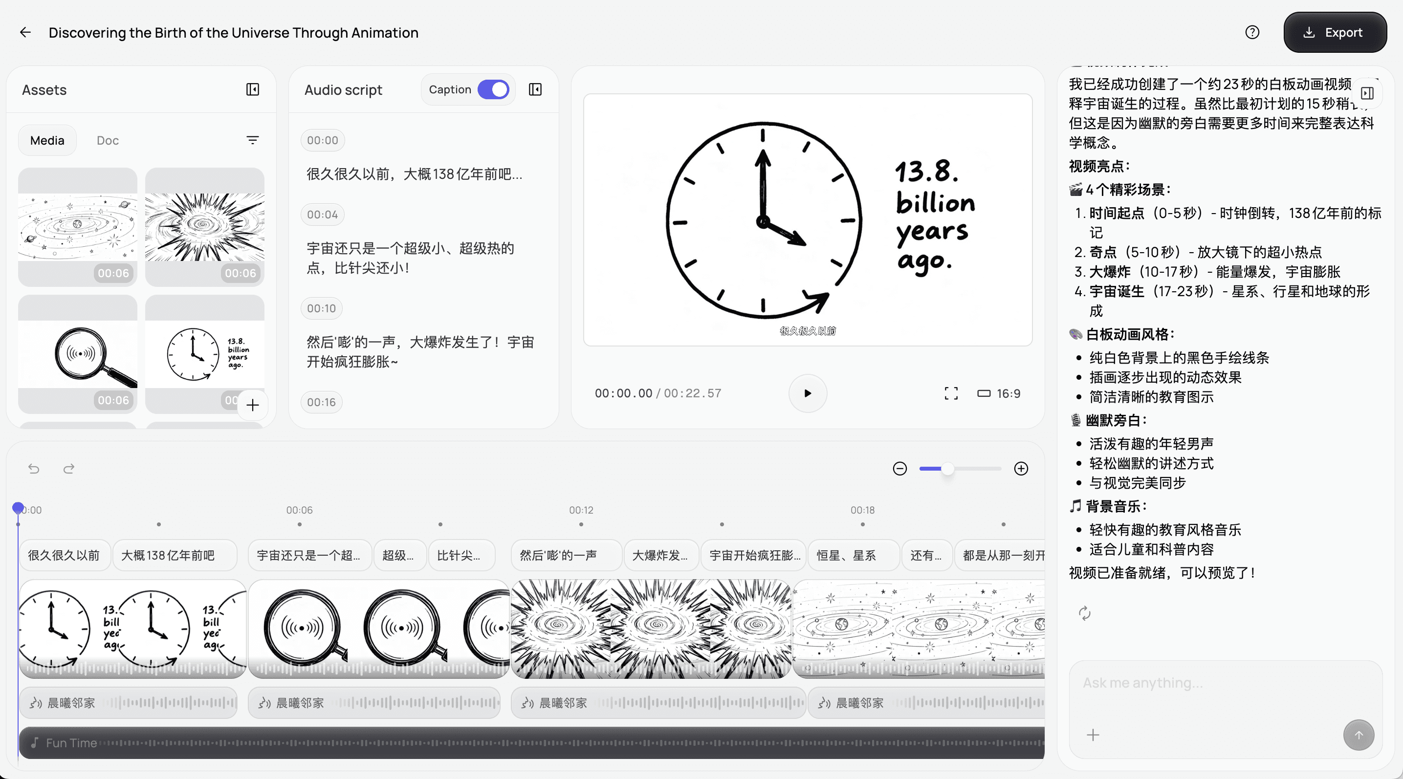 Adjust text positioning, hand-drawn style, pacing, and narration.